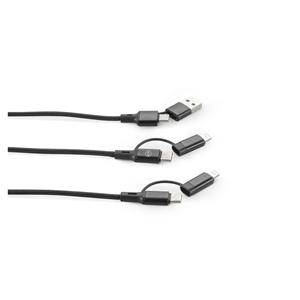 Descrição: Cabo super-rápido 6 em 1 em alumínio 20% reciclado e PET 4% reciclado. Permite carregamento super-rápido de 60W via USB-C e transferência de dados. Apresenta uma entrada dupla USB-A/USB-C e duas saídas com duas portas USB-C que podem ser utilizadas em simultâneo. Em uma das extremidades tem uma saída compatível com lightning com carregamento rápido de 27W e na outra extremidade uma saída dupla micro-USB e compatível com lightning de 10W. Fornecido em caixa presente de papel kraft reciclado. 1000 x 25 mm | Caixa: 155 x 40 x 30 mm