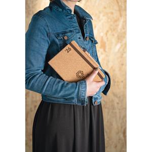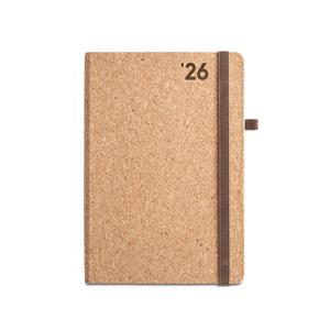 Descrição: Agenda A5 em cortiça. Possui um suporte para esferográfica (não inclusa), miolo em cor marfim e marcador em fita. Está organizada num plano diário (70 g/m²). Fornecida em bolsa de TNT. 148 x 210 mm | Bolsa: 205 x 250 mm