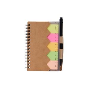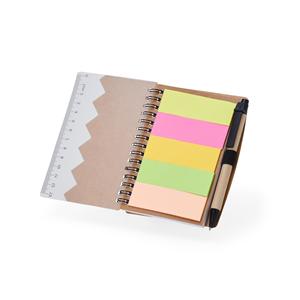 Descrição: Bloco de anotações ecológico com autoadesivos, régua e caneta, feito em kraft. Contém folha com régua 13 cm, cinco autoadesivos com aproximadamente 13 folhas, bloco com aproximadamente 69 folhas brancas com pauta, Porta-Canetas elástico e acompanha caneta de papelão com detalhes plásticos, carga esferográfica azul 1.0mm e acionamento por clique. Largura 10,5 cm Medidas aproximadas para gravação(CxL): Bloco 4 cm x 13,5 cm / Caneta - 3 cm x 0,7 cm Peso aproximado(g): 90 Tamanho total aproximado (CxL): Caneta - 13,8 cm x 1,4 cm Espessura 1,5 cm Altura 13,8 cm
