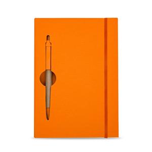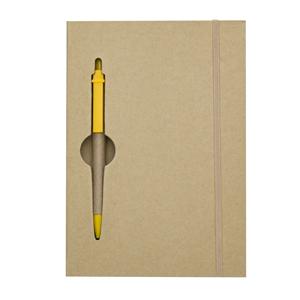 Descrição: Caderneta ecológica com capa e miolo vazados, utilizados como suporte para a caneta. Bloco com miolo de picote, elástico para lacre e caneta de papelão com detalhes plásticos, carga esferográfica na cor azul e acionamento por clique. Largura 13,5 cm Medidas aproximadas para gravação(CxL): 0,7 cm x 3,7 cm Peso aproximado(g): 249 Espessura 1,7 cm Altura 19,9 cm