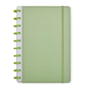 Descrição: Caderno capa dura em papelão, com elástico para fechamento e encadernação em discos plásticos reposicionáveis, que permitem acrescentar ou remover folhas compatíveis com facilidade. Conta com aproximadamente 80 folhas brancas pautadas. Largura 19 cm Peso aproximado(g): 418 Comprimento 26 cm Espessura 2,4 cm