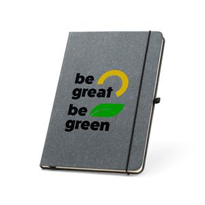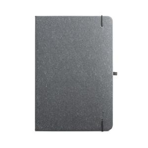 Descrição: Caderno A5 de capa dura em couro 70% reciclado. Contém 192 páginas pautadas cor marfim em papel proveniente de gestão florestal sustentável, suporte para caneta esferográfica (não inclusa), elástico e fita separadora em preto. Contém bolso interior. 140 x 210 mm