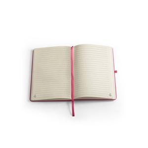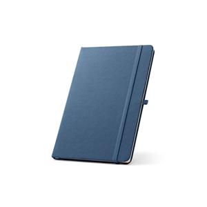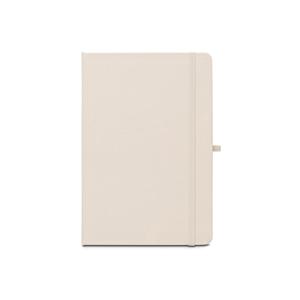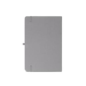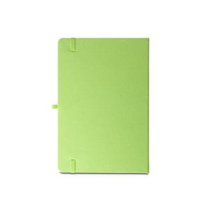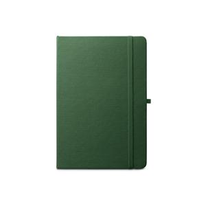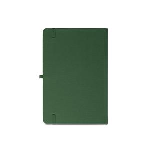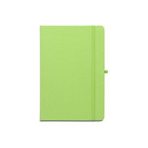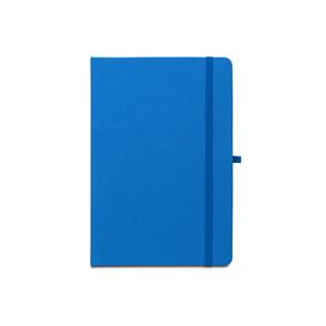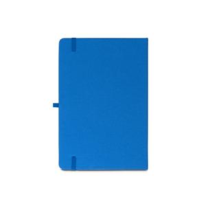 Descrição: Caderno A5 de capa dura em PET 100% reciclado (rPET) 300D, com cantos redondos. Contém 160 páginas, em papel 100% reciclado, pautadas cor de marfim, fita separadora, suporte para esferográfica (não inclusa) e elástico para fecho do caderno. Na parte inferior da lombada, tem impresso em branco o símbolo do rPET. 143 x 211 mm