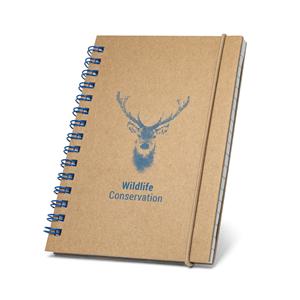 Descrição: Caderno de bolso espiral com 60 folhas pautadas de papel reciclado e capa dura em cartão com elástico. 100 x 140 mm