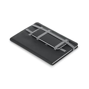 Descrição: Caderno A5 de capa dura em Couro Sintético, com 160 páginas lisas. Contém elásticos com capacidade para suportar caneta esferográfica (não inclusa), celular e cartões e um elástico para fechar o bloco de notas. Fornecido em bolsa de TNT. 150 x 210 mm | Bolsa: 185 x 240 mm