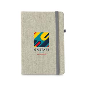 Descrição: Caderno A5 de capa dura em canvas (poliéster). Contém 192 páginas lisas em cor marfim, fita separadora, elástico e suporte para caneta esferográfica (não inclusa). Fornecido em bolsa de TNT. 148 x 210 mm | Bolsa: 185 x 240 mm