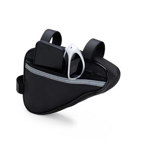 Descrição: Bolsa de quadro de bicicleta confeccionada em Oxford impermeável. Possui um único compartimento, além de duas alças de nylon com fechamento em velcro e uma tira reflexiva costurada próxima à abertura da bolsa. Largura 5 cm Medidas aproximadas para gravação(CxL): 5 cm x 13 cm Peso aproximado(g): 103 Profundidade 26 cm Altura 15 cm