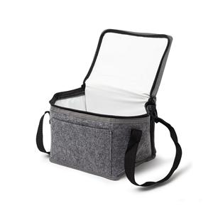 Descrição: Bolsa térmica feita em feltro com capacidade para 6 litros, possui revestimento térmico, bolso frontal e alças para as mãos. Largura 19 cm Medidas aproximadas para gravação(CxL): 6,5 cm x 13 cm Peso aproximado(g): 126 Profundidade 15 cm Altura 13 cm