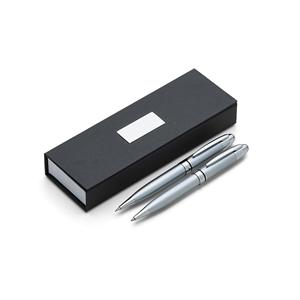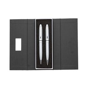 Descrição: Conjunto caneta e lapiseira em estojo de cartonagem com placa central para personalização. Clip metal e anel central possui: anel fino prata, anel preto fino e um anel maior prata com relevo e acionam por giro. Estojo revestida com espuma na parte interna. Largura 6,5 cm Medidas aproximadas para gravação(CxL): Caneta/Lapiseira 3,7 cm x 1,2 cm – Estojo 4,1 cm x 1,6 cm Peso aproximado(g): 130 Tamanho total aproximado (CxL): Caneta/Lapiseira 14 cm x 1,6 cm Comprimento 18 cm