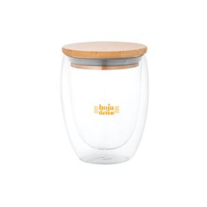 Descrição: Copo de viagem em vidro borossilicato com parede dupla isolada a ar e tampa em bambu. Copo com capacidade até 350 ml, ideal para líquidos frios ou quentes, tendo uma tampa com isolante em silicone que facilita o transporte do copo evitando respingo. Apto para ir ao microondas e à máquina de lavar, retirando a tampa. Food grade.