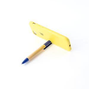 Descrição: Caneta em bambu com ponta e ponteira com suporte para celular em plástico, acionamento por rotação e carga esferográfica azul de 1.0mm. Largura 1,5 cm Medidas aproximadas para gravação(CxL): 0,8 cm x 7 cm Peso aproximado(g): 9 Altura 14,7 cm