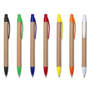 Descrição: Caneta de papelão com detalhes plásticos, carga esferográfica azul 1.0 mm e acionamento por clique. Largura 1,4 cm Medidas aproximadas para gravação(CxL): 4 cm x 1 cm Peso aproximado(g): 6 Comprimento 13,9 cm