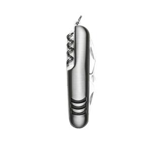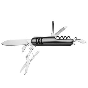 Descrição: Canivete metal 7 funções com detalhes emborrachados preto(três linhas frente e verso). Possui: lâmina de corte, mini tesoura, abridor de lata, abridor de garrafa, chave phillips, lixa e Saca-Rolhas. Acompanha bainha de nylon. Medidas aproximadas para gravação(CxL): 3,5 cm x 1 cm Peso aproximado(g): 76 Tamanho total aproximado (CxL): 9,2 cm x 2,5 cm