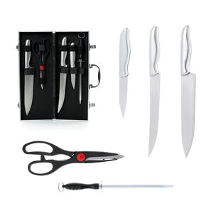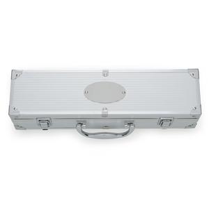 Descrição: Kit churrasco 5 peças em maleta de alumínio com travas de segurança, contém três facas de corte, tesoura e chaira. Parte interna da maleta com revestimento em tnt e suportes de velcro para fixação das peças. Medidas aproximadas para gravação(CxL): 4,5 cm x 6 cm Peso aproximado(g): 893 Comprimento 36,5cm Espessura 6 cm Altura 13,5 cm
