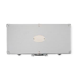 Descrição: Kit churrasco 10 peças em maleta de alumínio com travas de segurança e placa central para personalização. Contém: espátula, pegador, escova para grelha, faca, pincel, garfo e quatro espetos, parte interna da maleta com revestimento em TNT e suportes de velcro para fixação das peças. Largura 7,6 cm Medidas aproximadas para gravação(CxL): 4,5 cm x 6,3 cm Peso aproximado(g): 2195 Comprimento 42,7 cm Altura 21,5 cm