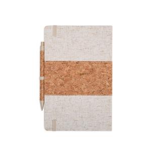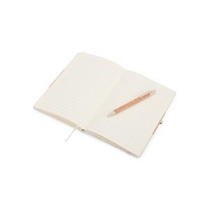 Descrição: Este kit contém uma Caderneta A5 em linho com detalhe em cortiça e suporte para caneta, marcador de página em cetim, aproximadamente 82 folhas com pauta e caneta de cortiça com detalhes em palha de trigo, carga esferográfica azul 1.0mm e acionamento por clique. Largura 20 cm Medidas aproximadas para gravação(CxL): 7 cm x 13,5 cm Peso aproximado(g): 275 Comprimento 24 cm Espessura 2 cm
