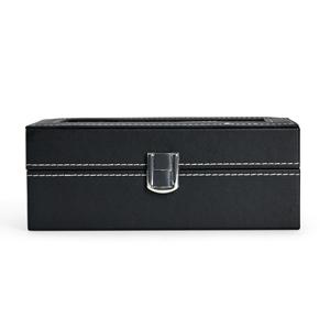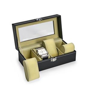Descrição: Porta-relógios com acabamento em couro sintético à base de PVC. Possui revestimento interno em veludo e quatro compartimentos fixos com almofadas removíveis de espuma. Conta ainda com visor transparente em vidro e trava de segurança para o fechamento do estojo. Medidas aproximadas para gravação(CxL): 2,5 cm x 18 cm Peso aproximado(g): 420 Profundidade 10,7 cm Comprimento 20,7 cm Altura 8 cm