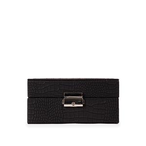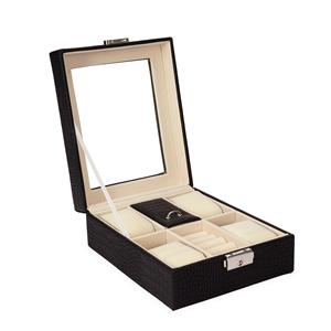 Descrição: Porta-relógios com acabamento em couro sintético. Conta com revestimento interno em veludo e seis compartimentos: quatro com almofadas removíveis, um para objetos menores e outro almofadado com ranhuras. Possui tampa com visor em vidro e trava de segurança. Acompanha chave para fechamento do estojo. Medidas aproximadas para gravação(CxL): 2 cm x 15 cm Peso aproximado(g): 609 Profundidade 20,2 cm Comprimento 16,2 cm Altura 7,7 cm