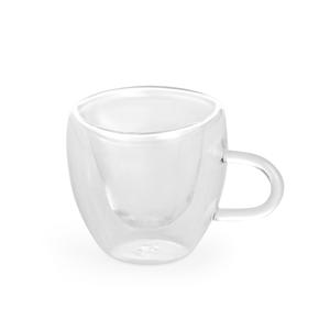Descrição: Xícara de vidro com capacidade para até 80ml. Possui contorno interno em formato de coração e estrutura de parede dupla que ajuda a impedir que a temperatura de líquidos entre em contato com a parte externa. Largura 9,7 cm Medidas aproximadas para gravação(CxL): 5 cm x 6 cm Peso aproximado(g): 60 Circunferência 21,5 cm Altura 6,2 cm