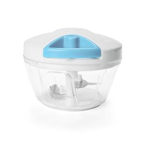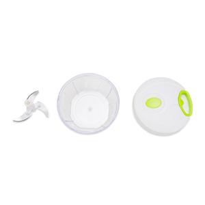 Descrição: Processador de alimentos manual, tampa plástica de polipropileno com puxador verde, pote transparente em poliestireno com relevo e lâminas em aço inox. Medidas aproximadas para gravação(CxL): 2 cm x 7,5 cm Peso aproximado(g): 203 Tamanho total aproximado (CxL): 10 cm x 12,7 cm