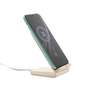Descrição: Suporte para celular com carregador por indução (wireless) super-rápido em fibra de palha de trigo e ABS. Com uma potência máxima de 15W, porta de entrada USB-C e incluso cabo USB-C de 1 m. Fornecido em caixa presente de papel kraft reciclado. A cor e o resultado da impressão nos materiais naturais pode variar entre produtos. 70 x 112 x 87 mm