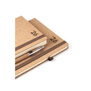 Descrição: Agenda A5 em cortiça. Possui um suporte para esferográfica (não inclusa), miolo em cor marfim e marcador em fita. Está organizada num plano diário (70 g/m²). Fornecida em bolsa de TNT. 148 x 210 mm | Bolsa: 205 x 250 mm