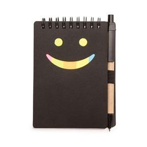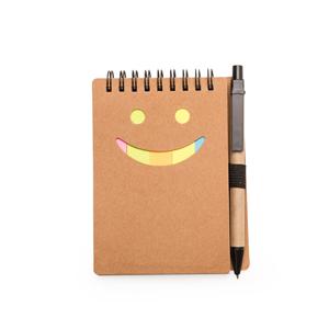Descrição: Bloco de anotações ecológico com caneta de papelão. Possui detalhe “smile” na capa frontal(verso liso), caneta ecológica com acabamentos em plástico acionada por clique, primeira folha(branca) com cinco blocos autoadesivos coloridos com aproximadamente 20 folhas cada, bloco amarelo com aproximadamente 20 folhas e 70 folhas brancas pautadas. Medidas aproximadas para gravação(CxL): 6,9 cm x 8,5 cm - Caneta 3,7 cm x 0,7 cm Peso aproximado(g): 83 Tamanho total aproximado (CxL): 14 cm x 10,4 cm – Caneta 13,9 cm x 1,3 cm