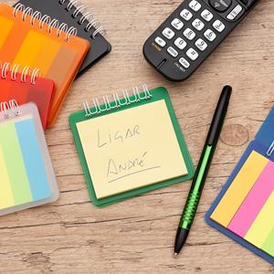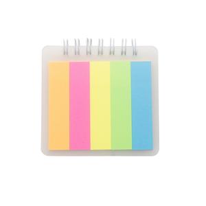 Descrição: Bloco de anotações plástico com autoadesivos e wire-o, contém cinco blocos autoadesivos coloridos com aproximadamente 25 folhas cada. Largura 8,5 cm Medidas aproximadas para gravação(CxL): 6,5 cm x 8,3 cm Peso aproximado(g): 31 Espessura 1,3 cm Altura 8,6 cm