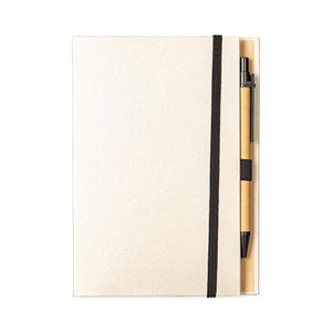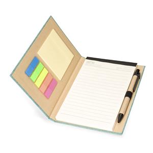 Descrição: Bloco de anotações com capa dura revestida em papel especial e fita elástica para fechamento. Possui cerca de 80 folhas pautadas, além de um bloco com aproximadamente 20 folhas autoadesivas amarelas e por volta de 100 marcadores de página autoadesivos, divididos em cinco cores diferentes. Acompanha uma caneta esferográfica com carga azul de 1.0mm e acionamento por clique, corpo em papelão e demais componentes em plástico. Largura 13 cm Medidas aproximadas para gravação(CxL): 18 cm x 9,5 cm (capa) - 0,8 cm x 10 cm (caneta) Peso aproximado(g): 187 Tamanho total aproximado (CxL): Caneta: 14 cm x 1 cm Comprimento 18 cm Espessura 1,4 cm