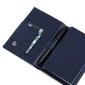 Descrição: Caderneta em couro sintético com Porta-Canetas e compartimento para arquivar folhas. Possui aproximadamente 80 folhas marfim sem pauta. Largura 11 cm Medidas aproximadas para gravação(CxL): 14 cm x 6 cm Peso aproximado(g): 183 Espessura 2,2 cm Altura 15,6 cm