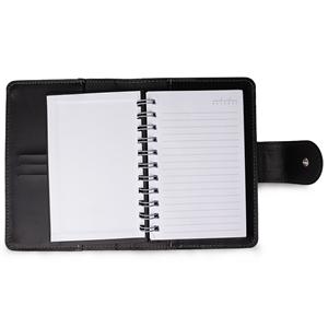 Descrição: Caderneta de couro sintético com fechamento de botão. Possui caderno capa dura em couro sintético com aproximadamente 100 folhas pautadas, divisórias para cartões e bolso lateral. Largura 14 cm Medidas aproximadas para gravação(CxL): 5 cm x 6,5 cm Peso aproximado(g): 282 Espessura 2,5 cm Altura 18 cm