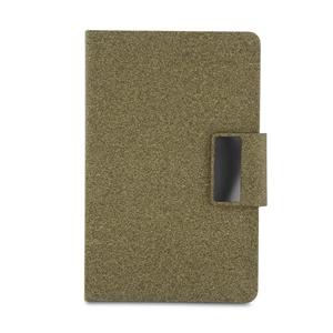 Descrição: Caderneta com capa em PU revestida com fibra de café ou chá, engate para caneta com fecho magnético e placa metálica, marcador de páginas em fita de cetim e cerca de 80 folhas pautadas. Largura 14,2 cm Medidas aproximadas para gravação(CxL): 19 cm x 12 cm (capa) - 4,5 cm x 2 cm (placa metálica) Peso aproximado(g): 237 Comprimento 20,8 cm Espessura 1,7 cm