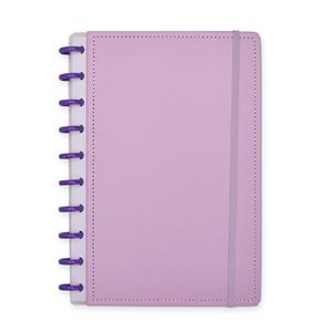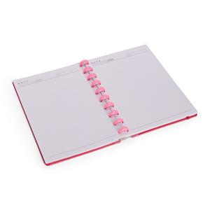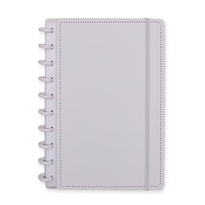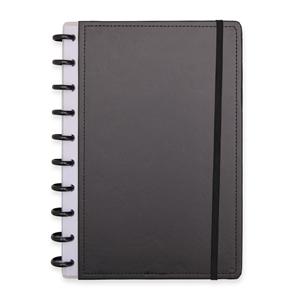 Descrição: Caderno capa dura em papelão, com elástico para fechamento e encadernação em discos plásticos reposicionáveis, que permitem acrescentar ou remover folhas compatíveis com facilidade. Conta com aproximadamente 80 folhas brancas pautadas. Largura 19 cm Peso aproximado(g): 418 Comprimento 26 cm Espessura 2,4 cm
