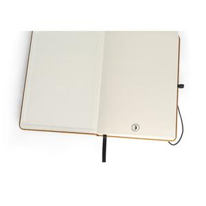 Descrição: Caderno A5 de capa dura em couro 70% reciclado. Contém 192 páginas pautadas cor marfim em papel proveniente de gestão florestal sustentável, suporte para caneta esferográfica (não inclusa), elástico e fita separadora em preto. Contém bolso interior. 140 x 210 mm