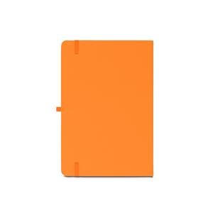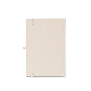 Descrição: Caderno A5 de capa dura em PET 100% reciclado (rPET) 300D, com cantos redondos. Contém 160 páginas, em papel 100% reciclado, pautadas cor de marfim, fita separadora, suporte para esferográfica (não inclusa) e elástico para fecho do caderno. Na parte inferior da lombada, tem impresso em branco o símbolo do rPET. 143 x 211 mm
