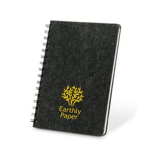 Descrição: Caderno A5 de capa semi-rígida em feltro 100% reciclado, com argolas. Contém 160 páginas pautadas (70 g/m²) em papel cor de marfim 100% reciclado. 155 x 219 mm