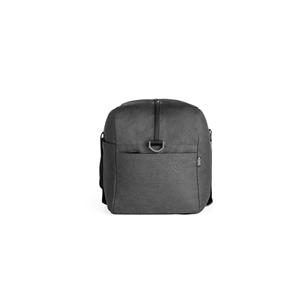 Descrição: Bolsa esportiva em rPET 600D com interior forrado e fundo com placa semi-rígida. Compartimento principal e bolso frontal com fecho e dois bolsos laterais, um em rede e outro com fecho. A bolsa tem alça de ombro removível e ajustável em webbing com reforço almofadado.