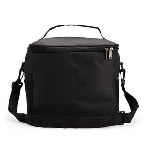 Descrição: Bolsa térmica confeccionada em Oxford resistente à água, fechamento em zíper, alça de nylon na tampa e capacidade de até 11 litros. Possui revestimento térmico em PEVA atóxico, além de compartimento frontal com plaquinha de couro sintético fixada por velcro e dois bolsos laterais em tela de tecido respirável com elástico. Acompanha alça transversal removível e ajustável. Largura 23,5 cm Medidas aproximadas para gravação(CxL): 2 cm x 4 cm Peso aproximado(g): 279 Profundidade 16,5 cm Altura 18 cm