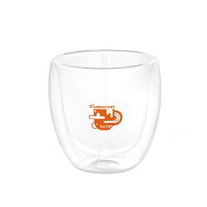 Descrição: Copo em vidro borossilicato com parede dupla isolada a ar. Capacidade até 220 mL. Fornecido em caixa presente personalizável. Certificação EU Food Grade. ø80 x 86 mm