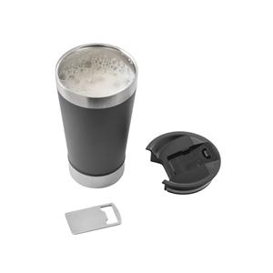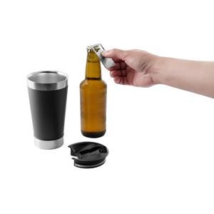 Descrição: Copo de viagem em aço inox térmico, com parede dupla isolada a vácuo. Capacidade até 630 mL. A tampa inclui um abridor de garrafas. Ideal para preservar as suas bebidas frias ou quentes. Fornecido em caixa presente de papel kraft reciclado. Certificação EU Food Grade. ø97 x 171 mm