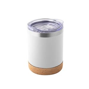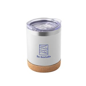 Descrição: Copo de viagem em aço inox térmico, com parede dupla isolada a vácuo. Capacidade até 400 mL. Parede com acabamento fosco e base em cortiça. Contém uma tampa transparente com fecho deslizante. Fornecido em caixa presente de papel kraft reciclado. Certificação EU Food Grade Ø93 x 121 mm