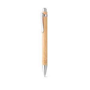 Descrição: Caneta esferográfica em bambu com clipe de metal. Escrita em azul até 1,5 km. A cor e o resultado da impressão nos materiais naturais pode variar entre produtos. ø11 x 138 mm