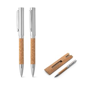 Descrição: Caneta esferográfica com corpo em cortiça e clipe em metal. Possui mecanismo twist e escrita em azul até 1,5 km. Fornecida numa bolsa presente de cortiça. A cor e o resultado da impressão nos materiais naturais pode variar entre produtos. Esferográfica: ø11 x 137 mm | Bolsa: 155 x 40 mm