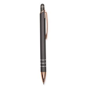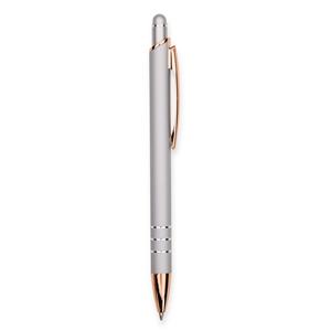 Descrição: Caneta metálica com carga esferográfica azul de 1,0mm e acionamento por clique com acabamento emborrachado para interação em dispositivos com tela sensível ao toque. Largura 1,4 cm Medidas aproximadas para gravação(CxL): Caneta Metal Touch Peso aproximado(g): 16 Comprimento 14,3 cm