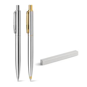 Descrição: Esferográfica em metal com corpo brilhante e clipe. Fornecida Fornecida em estojo almofadado. ø10 x 131 mm | Caixa: 182 x 22 x 42 mm