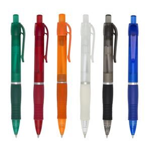 Descrição: Caneta de Plástico com detalhe emborrachado, carga esferográfica azul 1.0 mm e acionamento por clique. Medidas aproximadas para gravação(CxL): 3,2 cm x 0,8 cm Peso aproximado(g): 9 Tamanho total aproximado (CxL): 13,7 cm x 1,6 cm