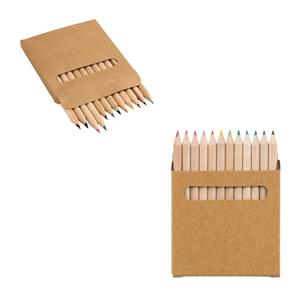 Descrição: Caixa de papel kraft reciclado com 12 lápis de cor. Produto certificado de acordo com a portaria Inmetro nº423 de 8/out/2021. 90 x 90 x 9 mm