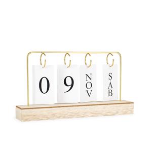 Descrição: Calendário permanente de mesa com base feita em MDF e moldura de ferro. Conta com fichas em papel cartão que permitem montar a data, trazendo o dia em números e o mês e os dias da semana em versões abreviadas. Medidas aproximadas para gravação(CxL): 2 cm x 26 cm Peso aproximado(g): 272 Profundidade 5,4 cm Comprimento 29,3 cm Espessura 3 cm Altura 16 cm