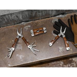 Descrição: Alicate dobrável com ferramentas multifunções em aço inox e madeira, com 20 funções. Fornecido em bolsa em poliéster. 45 x 100 x 25 mm | Bolsa: 65 x 140 x 30 mm