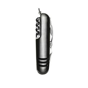 Descrição: Canivete metal 11 funções com detalhes emborrachados preto(três linhas frente e verso). Possui: lâmina de corte, serrilha, serra madeira, mini tesoura, abridor de latas, abridor de garrafa, chave phillips, lamina de remoção e limpeza, lixa, agulha de sutura e Saca-Rolhas. Acompanha bainha em nylon. Medidas aproximadas para gravação(CxL): 3 cm x 1 cm Peso aproximado(g): 101 Tamanho total aproximado (CxL): 9,3 cm x 2,5 cm